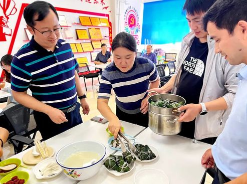 办公室变身“粽艺工坊”,糯米、红豆、列队待命!老师秒变 “厨房大神”,粽叶折成小漏斗,馅料塞满满,绳子一缠,齐活! 一个个四四方方的粽子闪亮登场,成就感直接爆棚!大家边包边唠家乡端午趣事,欢乐笑声都快掀翻食堂屋顶啦~