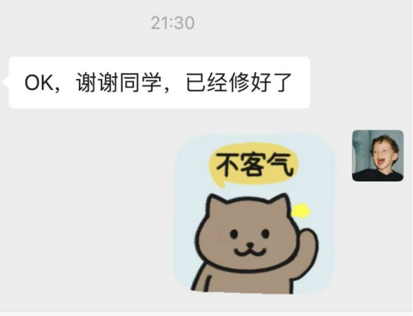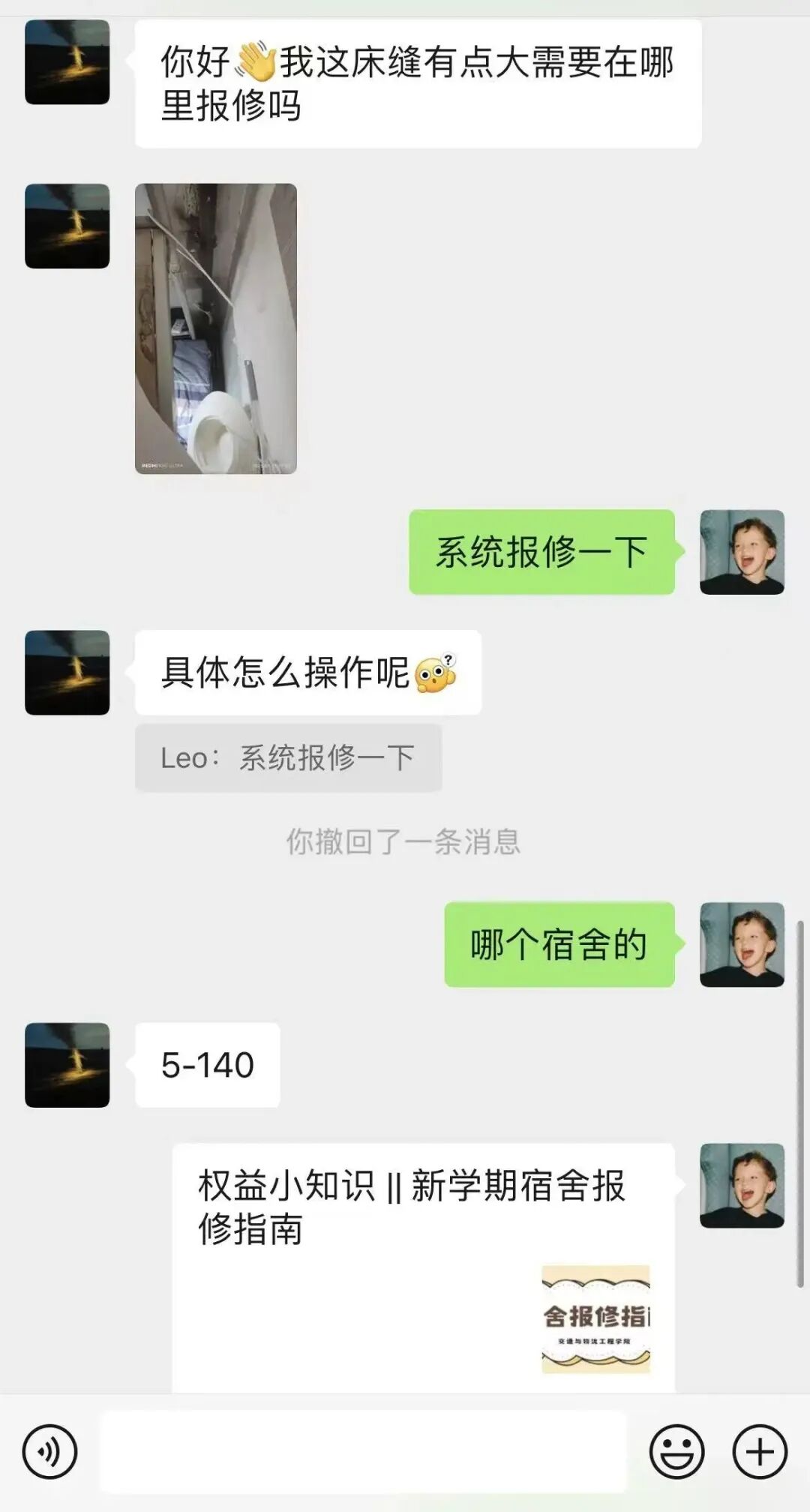 A2:得知同学反映的上铺护栏损坏情况,小益第一时间联系后勤维修团队。考虑到安全隐患的紧迫性,维修师傅连夜携带专业工具到场,对损坏护栏进行了加固修复,现已恢复稳固状态,切实保障了同学的住宿安全。