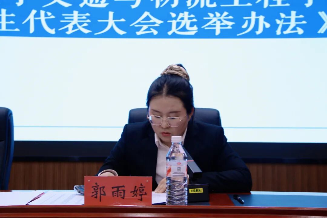 郭雨婷宣读《新疆农业大学交通与物流工程学院第九次团员暨学生代表大会选举办法》。